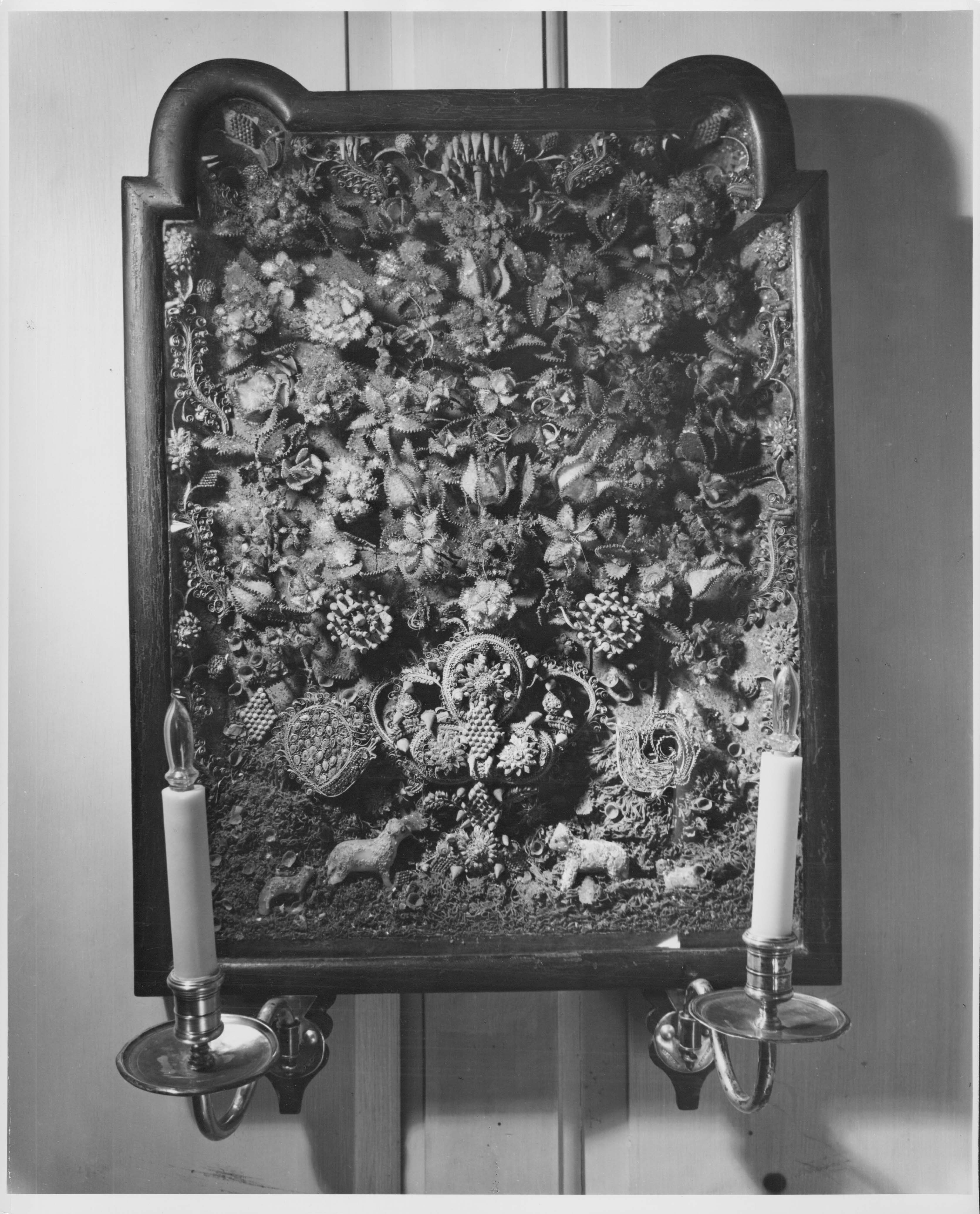 The walls were covered with detailed murals or wallpapers; the one above is wallpaper from France.
